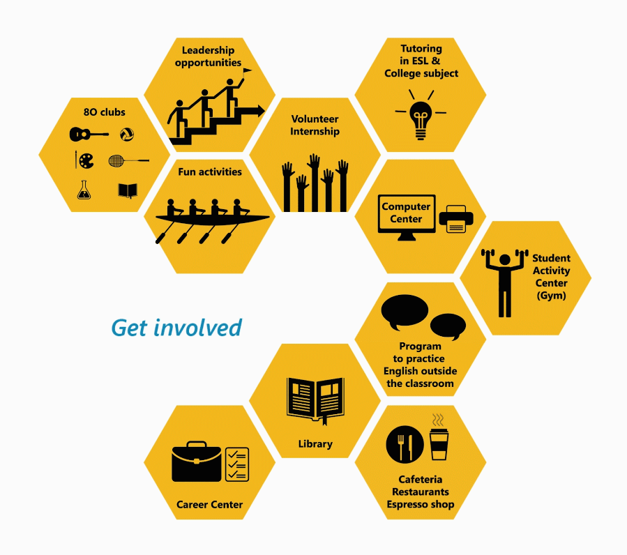 An introductory web page with simple layouts, fun illustrations and interactive motion graphics to create dynamism, and youthfulness; at the same time, using a lot of icons to help international students (non native English speaker) easily capture information.